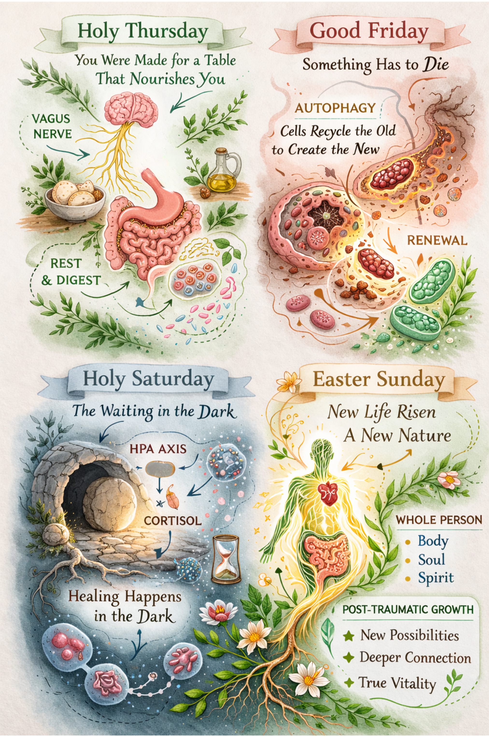 Nobody talks about Holy Saturday. We talk about the cross. We talk about the empty tomb. But that in-between day when the disciples sat in a sealed room, not knowing if anything was happening, not knowing if the story was over, this one gets skipped. Which is strange, because Holy Saturday is where most of us actually live: You have made the decision, changed your practices. You have let something die. And now? Nothing seems to be happening. You don't feel different, the lab results haven't shifted yet, the energy hasn't returned, the prayer still feels shallow. You are in the tomb, and the tomb is dark, and information is not enough. This is not failure but the most biologically accurate part of the entire sequence. Here is what is actually happening inside you during what looks like nothing: